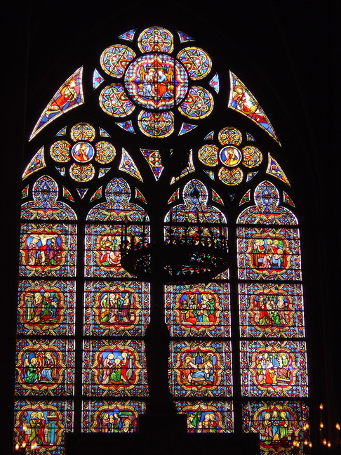 漫步聖母院中,石砌的龐大建築體不顯笨重,挑高三樓多的屋頂被二層柱子撐起,緩步其中更感到人的微小。從二側的拱窗射進金黃色溫暖的日光,懸掛在廊柱上的燭光閃爍,連接成列的火光在晃動間,在人的心裡投射某種沉默咒文似的安定,而燭光更在教堂裡暈染出微微朦朧的夢幻似的光譜,幽深而帶著令人靜默的張力。