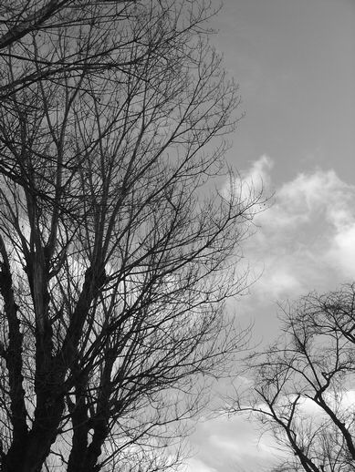 站在師大公園裡抬頭看,透過逆光時漆黑的枝條,一線線勾勒出無法模擬重現的圖樣。沒有葉子的欖仁樹對我特別有種吸引力,逆光時全黑的枯寂,和體內深處某個空洞挺類似的吧,我猜。