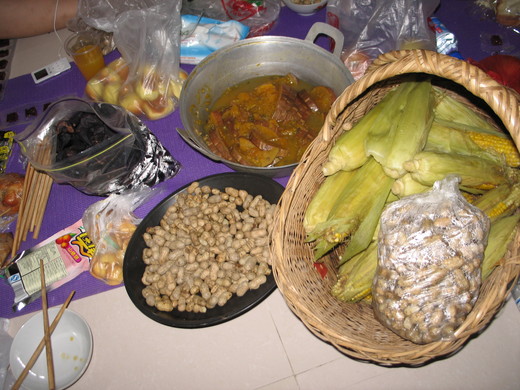 孩子在路上吃了些餅乾、糖果,所以不鬧著吃晚餐。但是我們還是拿出家中帶來的飲食,雖然媽媽們都各有絕活,但是冷的吃食還是照顧不了胃。未料農婦帶來了熱食,都是剛收成的農作:花生、荸薺、南瓜、綠豆、菱角、玉米,在熱水裡煮過,不加任何佐料。孩子們對麻煩的吃食都不太感興趣,倒是吃了不少花生和玉米。