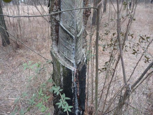 我們隨著販子進入一片松林,每株都有二十年左右的樹齡,在約莫半個人高的地方,都割除了箭翎形狀的樹皮。問了販子,才知道是為了取松脂用,取松脂既久,松樹萎瘠,松葉零落,活不得多久,我們取來無用,只得放棄。我站在樹邊,撫摸著樹皮,由刻痕邊上緩緩淌下的黏稠汁液,似淚似血,卻聽不到哭聲。