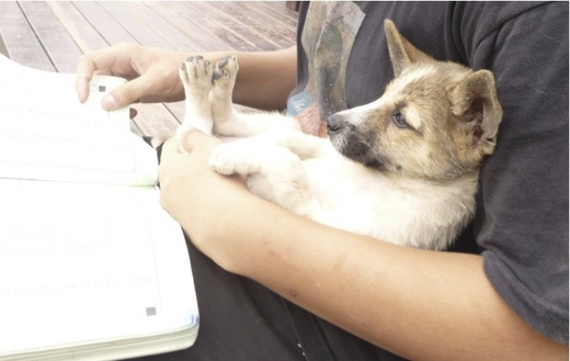 延極原本最受狗兒喜愛,讀書氣悶,便與狗兒玩耍。三隻大狗中最幼的一隻是2008年的夏令營時抱來的花狗,正好比這隻小花狗大上一歲,我們呼之為「小花」,這隻比小花還小的流浪狗,我們就叫「小小花」了。