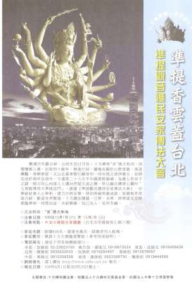 10/1-2(週末/日)首次在北市中油國光會議廳1、2樓舉辦的"百年準提觀音傳法大會",參與所獲益者就如同一位遠自美國特地返台參與盛會的師父所提及~這次十方禪林首次在台灣舉辦大會並不同於一般的法會,而是上首下愚大和尚在歷經26次閉關後首次將修持準提法的寶貴心得作公開傳法的無私分享(且隨喜報名參與)! 個人以為這兩天有前來聆聽參與者,應是與準提觀音有緣有福之人。且首次傳法大會內容精采,不論是上師傳法講儀軌的部分或相應到為人處事方面抑或是穿插雅興節目如:北京知名藝術團體的古琴與現場國畫/唱誦等表演或是國內佛教團體的佛教舞蹈表演都值得讚歎! No wonder有很多人都覺得短短一天半的大會卻讓人有餘音繞樑與意猶未盡的感覺. 最後主辦的理事長感性的分享首次籌備大會的過程與辛酸時,則又令人為之感動與鼻酸! However,相信只要方向確定並堅持到最後,一定能功成果滿! 感恩佛母與上師讓弟子眾等有緣欣逢此盛會,小女子穫益良多,更確認自己目標所在! 有空也歡迎至昊雲(cyndi8862) 的facebook 看看相關訊息與照片喔!