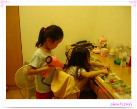 姐姐架式十足,有模有樣地幫妹妹吹乾頭髮。