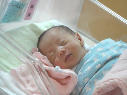照片上的是哥哥,雖然在睡覺卻好像知道我在拍照,一直在偷笑唷,弟弟就睡的很沉了,兩個小北鼻真的很可愛!因為剛出生還沒有取名字,暱稱是兩隻小老虎,老師還跟我說了一個新暱稱,因為醫院都會幫剛出生的雙胞胎標上A跟B來表示哥哥跟弟弟,所以他們的新綽號是「AB優酪乳」XD而且他們還有一個三歲的小姊姊暱稱小花,可惜今天沒有看到她,上次見到她才兩歲多呢,現在已經三歲了!