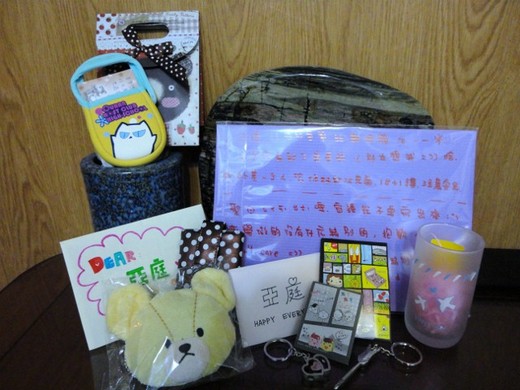 照片上的禮物,是今年19生日的痕跡,很多人說19歲是不能過生日的,但我其實不迷信,而收到多位好友的祝福,更讓我感動萬分!以往在國一、高一或是剛分班時,因為一開學就是生日,跟大家都還不熟,總是只有收到少數人的祝福,但這次大學同學們給了我好大的驚喜!!我第一次在第一學期,就收到新朋友的生日禮物>///<當然,還有國高中的姐妹們和家人,無論是簡訊、電話問候或是Facebook上的「生日快樂」!