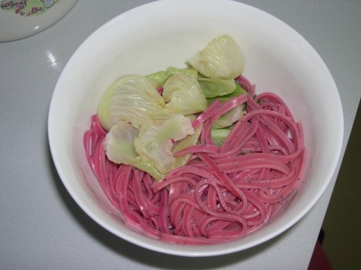 火龍果麵條在下水前呈現深紫色,不過下了鍋後開始退色,等麵條都撈起來的時候,整鍋水都紫紫的,這可是天然的火龍果色喔。
