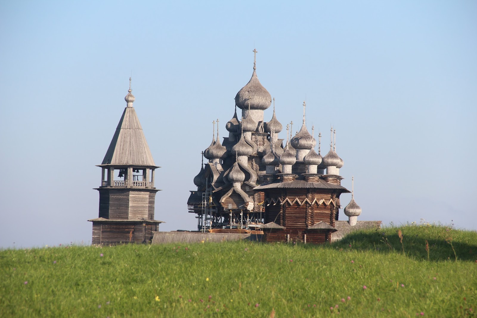 耶穌顯聖教堂有22個圓頂(洋蔥圓頂 Domes),木造的建築,沒有使用任何一根鐵釘,完全是木材和木栓建成的。這些特別的洋蔥圓頂,在陽光下好似魚鱗片,它是由斧頭將白楊木一片一片削成的。這座教堂大約建於1714年,是最後一個被保存下來的同類型教堂,其他的因為大火都被燒掉了。這個教堂也被稱為夏季教堂,因為沒有加熱設備,所以冬天是關閉的。但在大教堂的旁邊有一個大約在1764年重建的代禱教堂,擁有9個洋蔥圓頂的冬季教堂。當大教堂10月份開始關閉的時候,就會使用這是個有加熱設備的小教堂。當我們9月份拜訪時,應該還屬於大教堂開放的時間,但因為大教堂已年久失修,有些地方都剝落損壞了,正在重新整修,所以只有冬季教堂可以參觀。