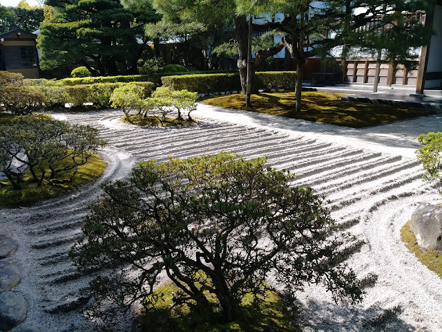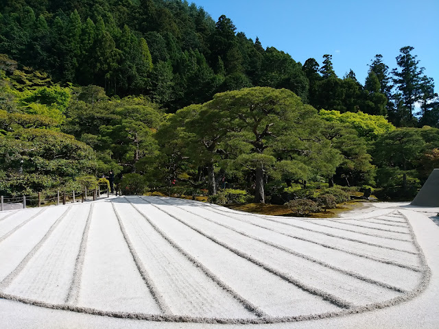 銀閣寺是以她的庭園枯山水聞名,這些小砂石在陽光下發揮了銀色本能,微微焛爍,銀白的光,還真讓人眼睛為之一亮又差點睜不開眼呢!