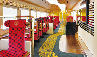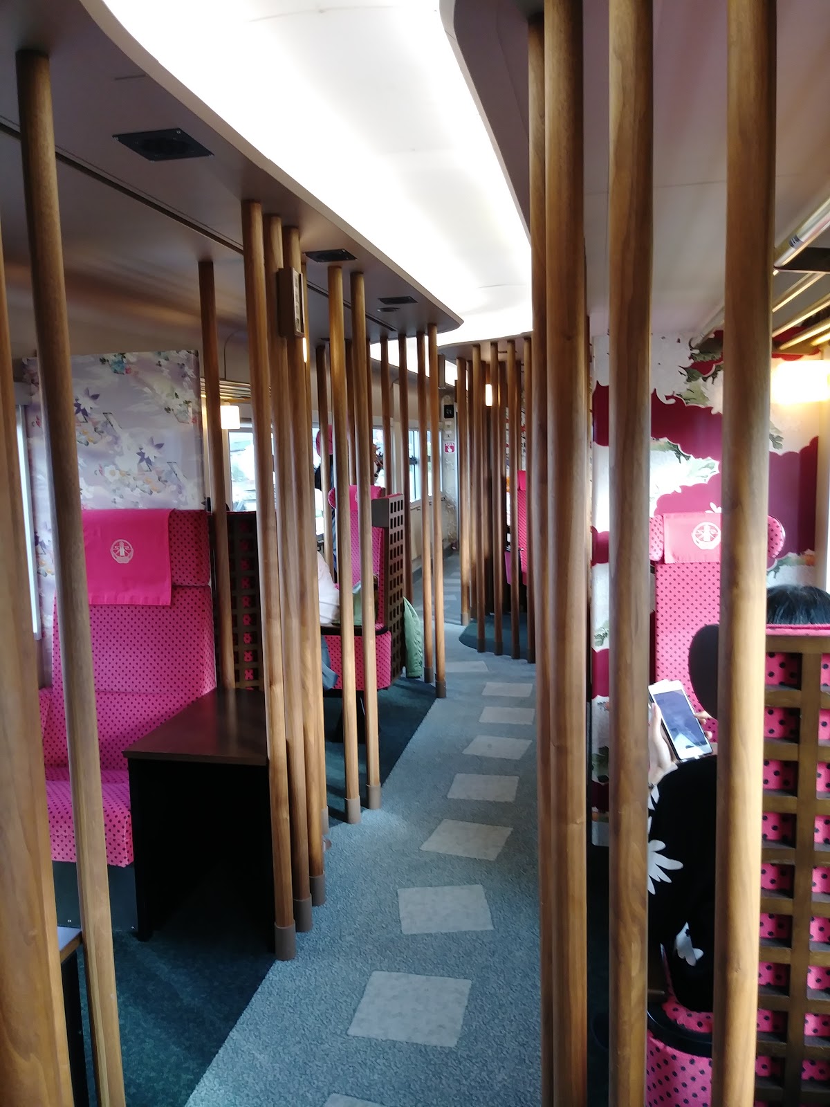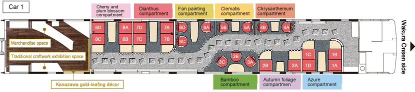 第一節車廂由木條分隔出8個私人空間的座位,走道上則舖著象徵日本花園踏脚石的圖案。