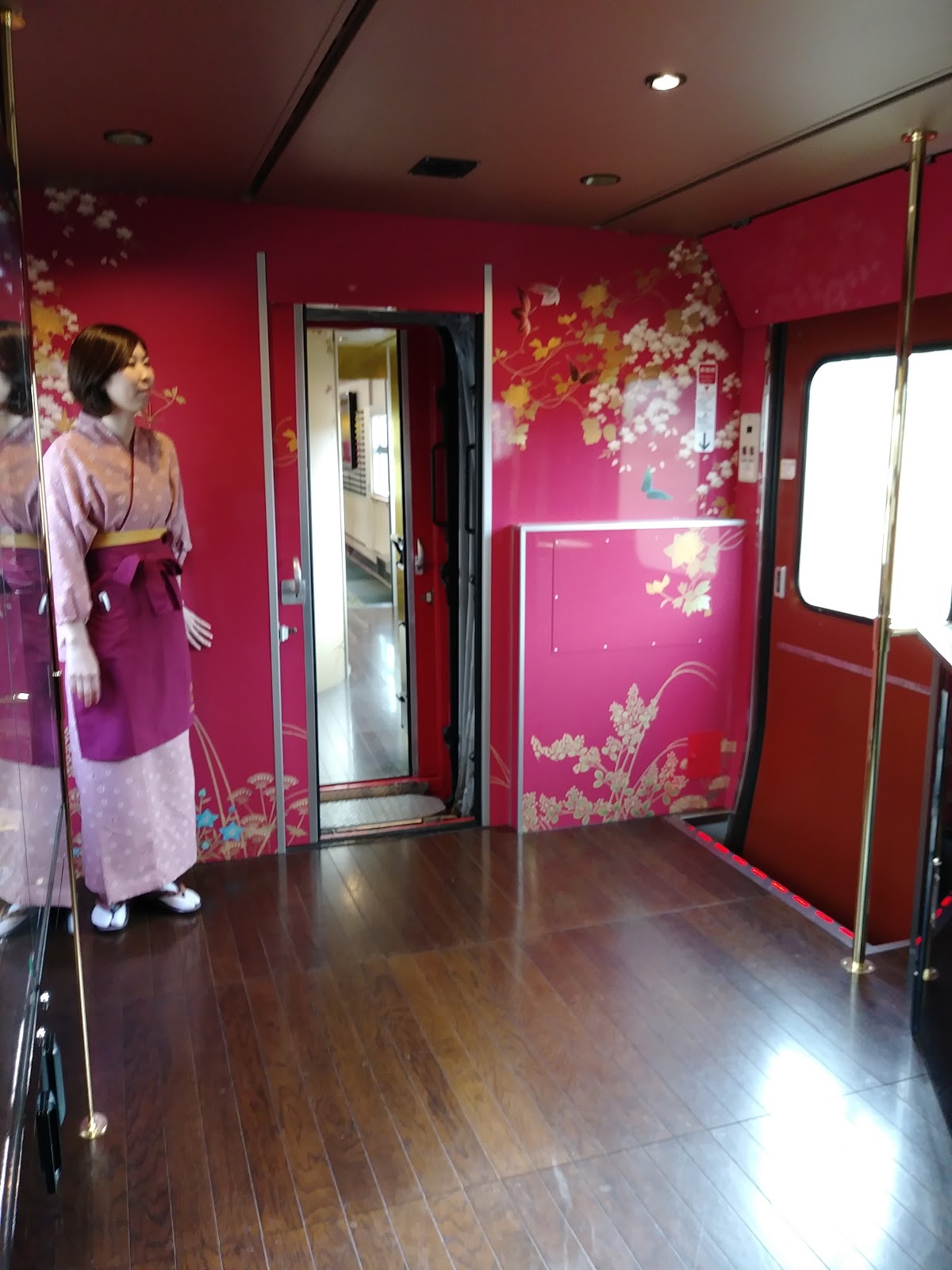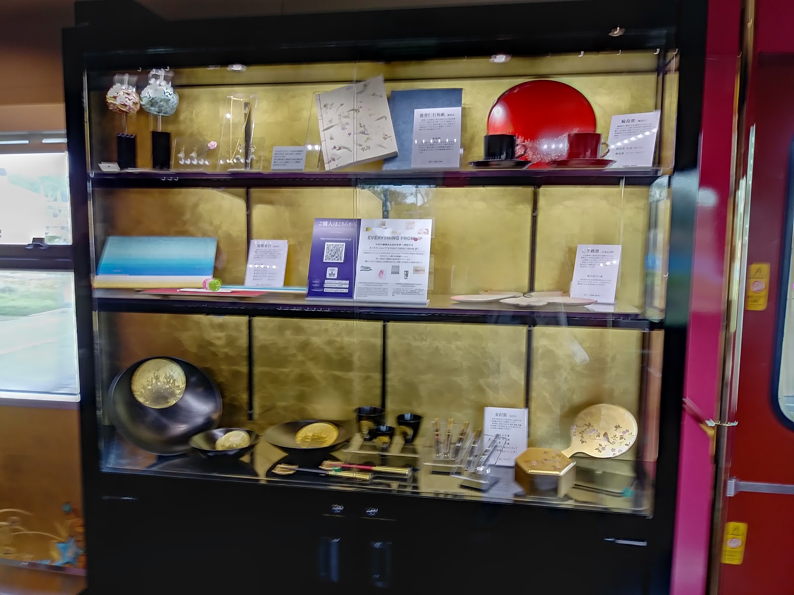 第一節車廂的入口,設計理念採用日本北陸傳統藝術,漆器與金箔。