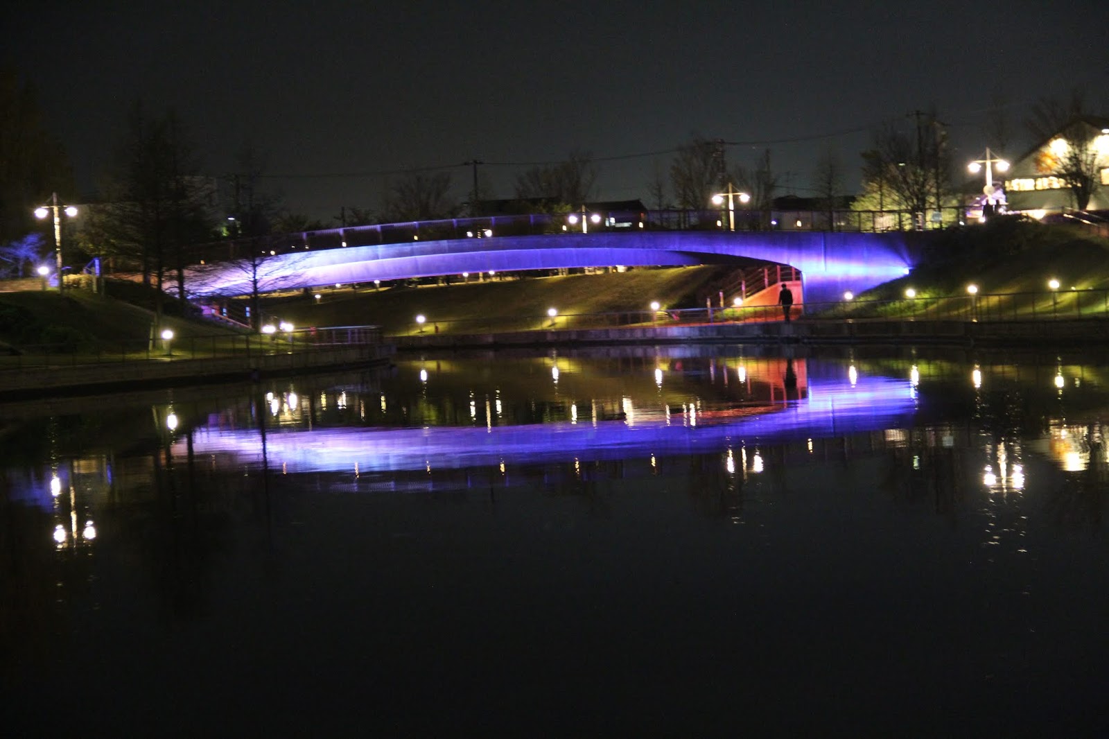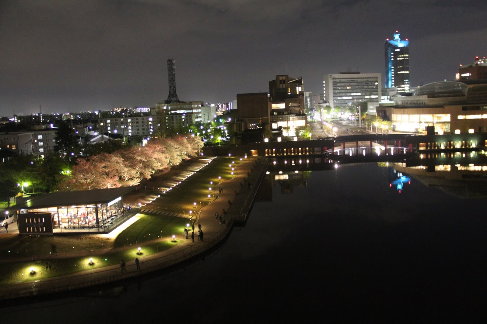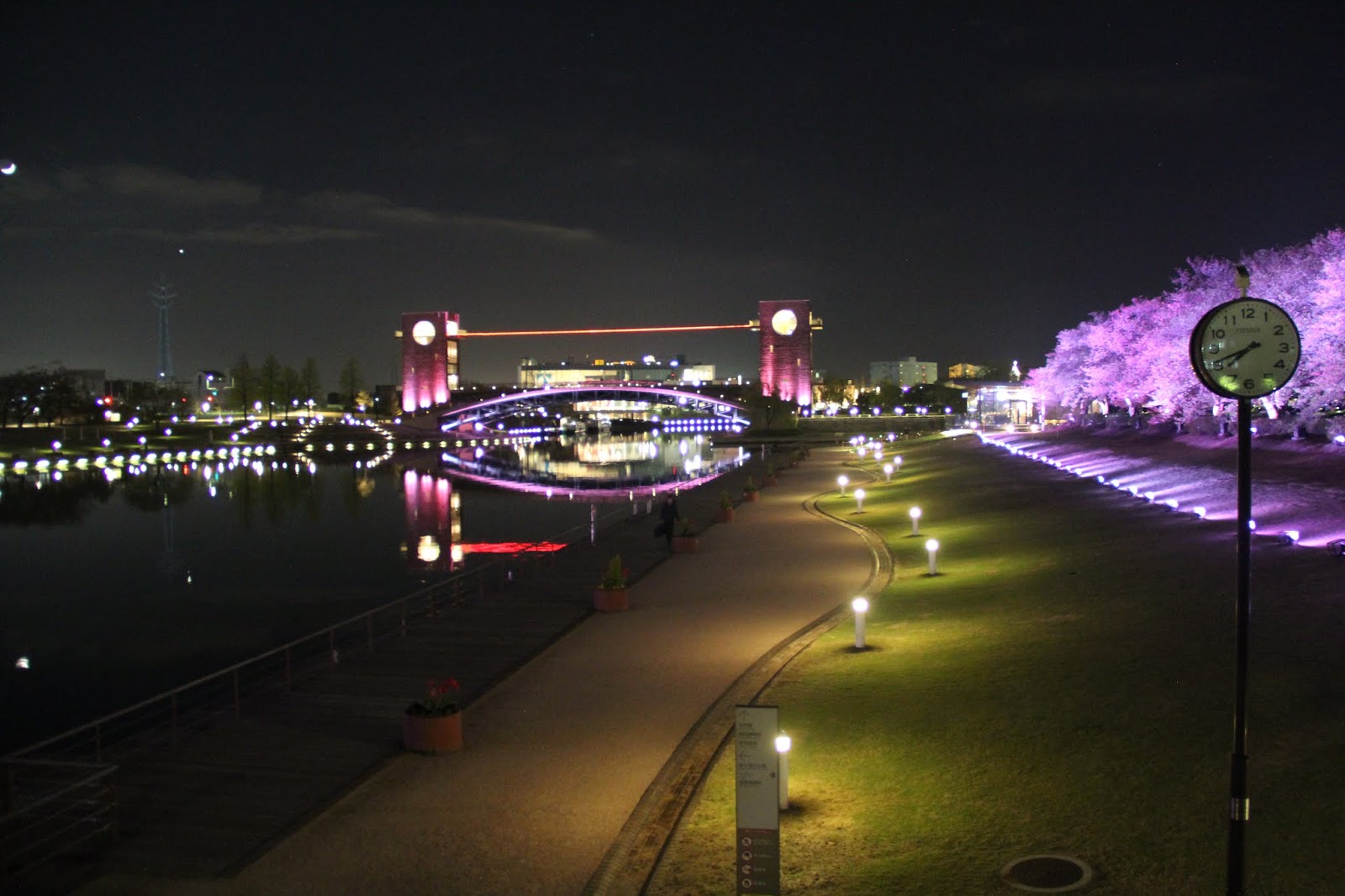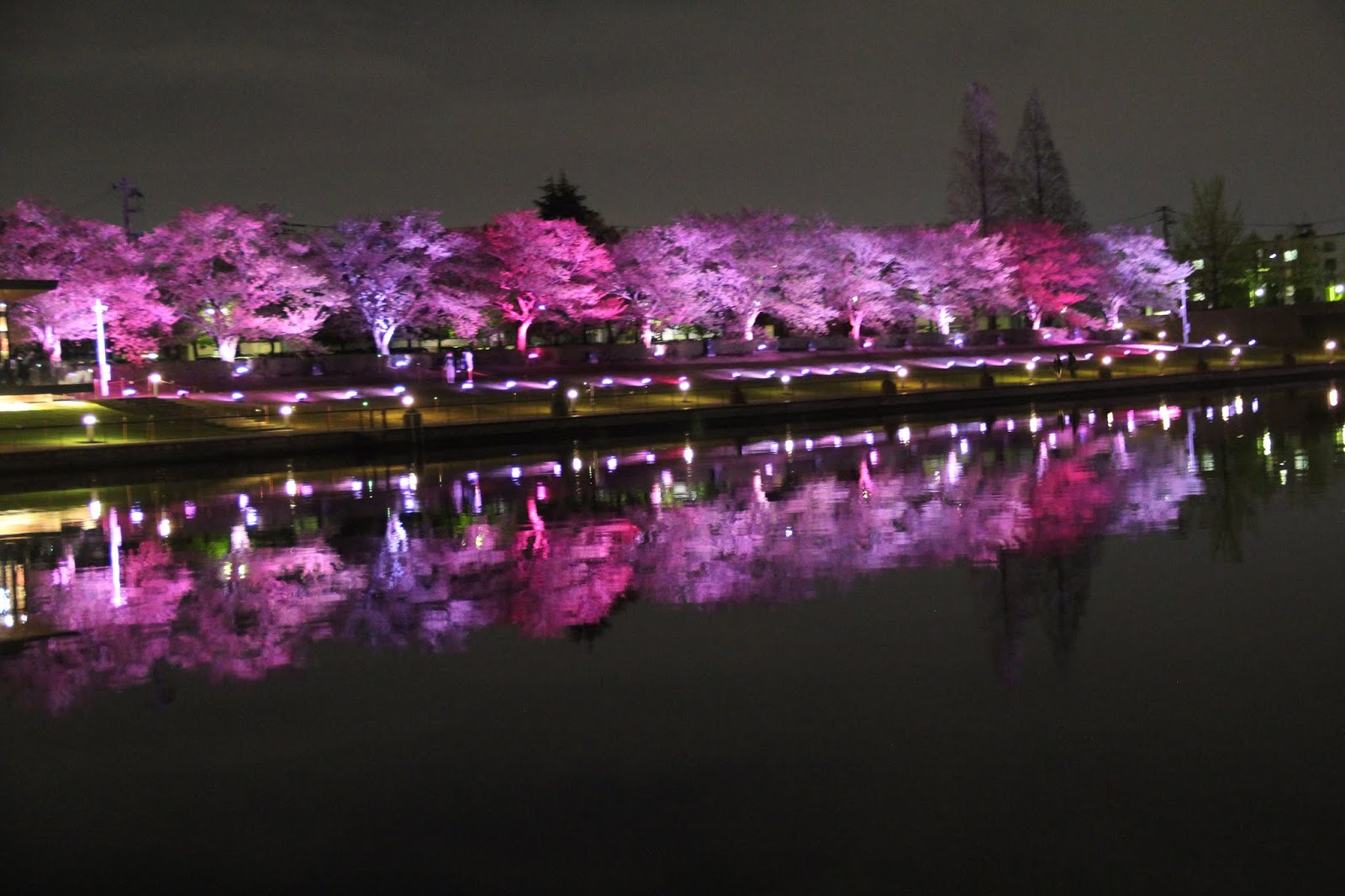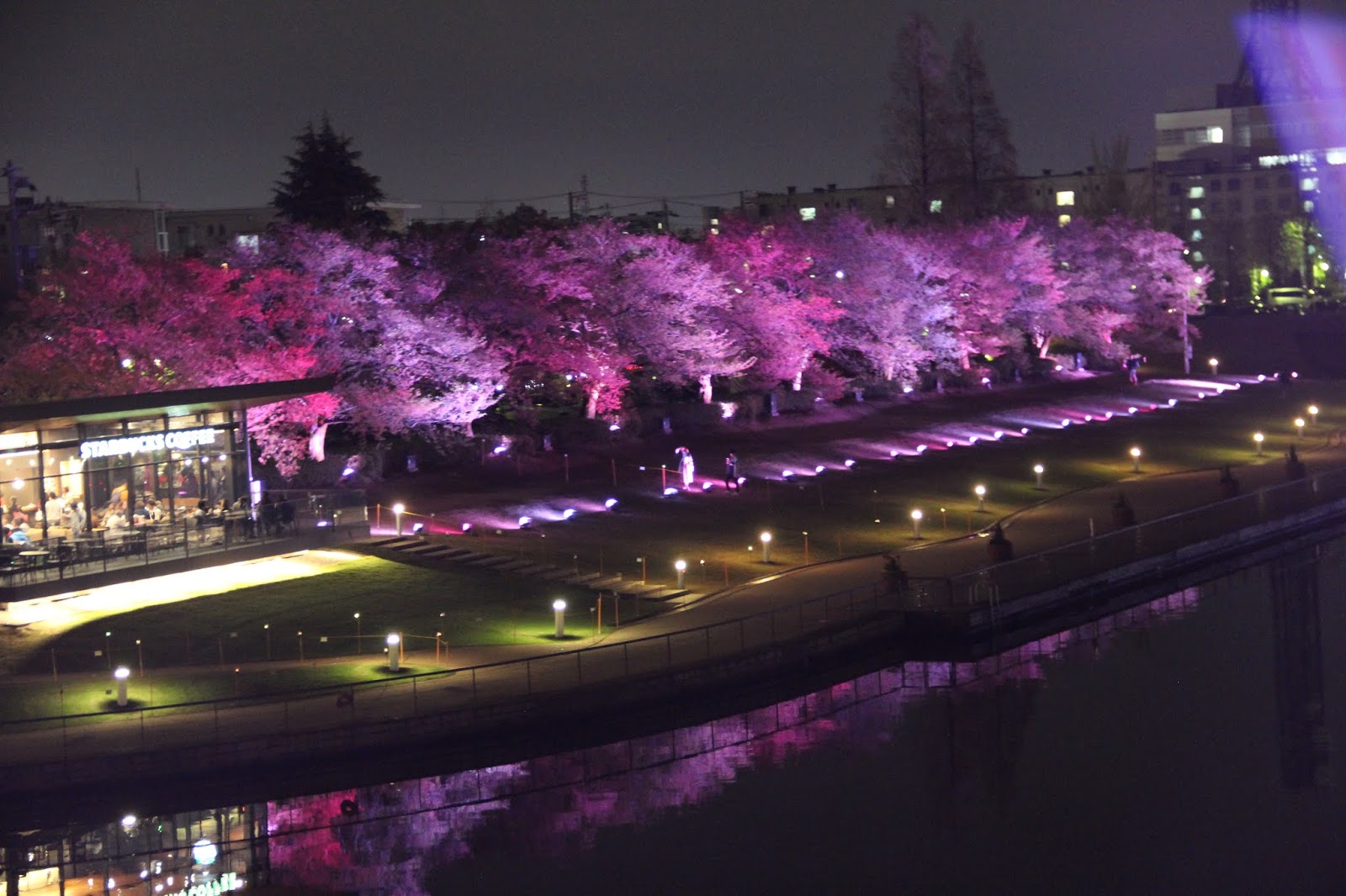 除了城堡的夜景,富岩運河環水公園的夜景,更是魅力無窮,美不勝收。在這裡有一間號稱是全世界最美的星巴克咖啡館,我帶著懷疑的態度一探究竟。還沒見到星巴克,就見到一排超夢幻的粉紅色夜櫻,不經讓我驚叫連連。怎麼這麼幸運,竟然讓我看見她們,原本就不期待這次的旅行會看見櫻花,更何況是粉紅泡泡的夜樱,太美了!
