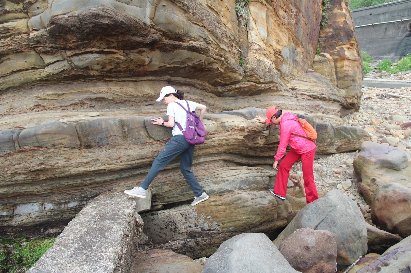 兩位女士還有一隻狗,驚險越過岩石。