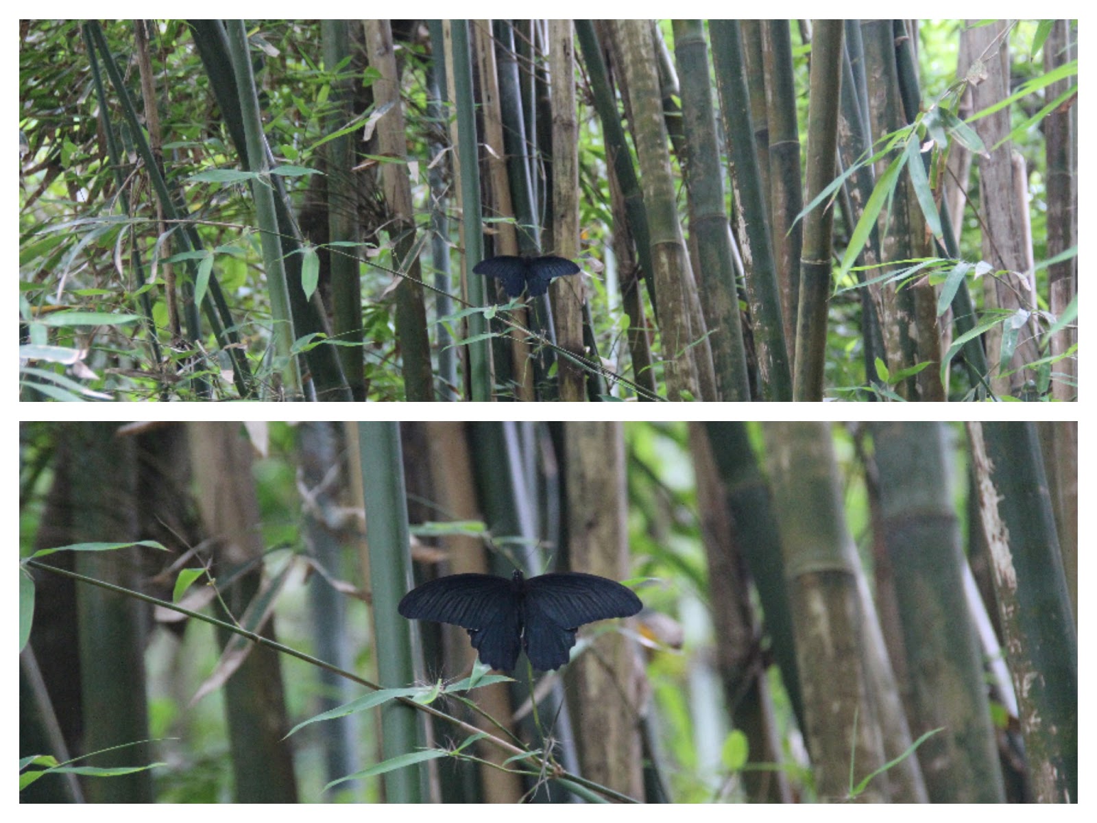 下山時,在竹林裡遇見美麗的黑蝴蝶。