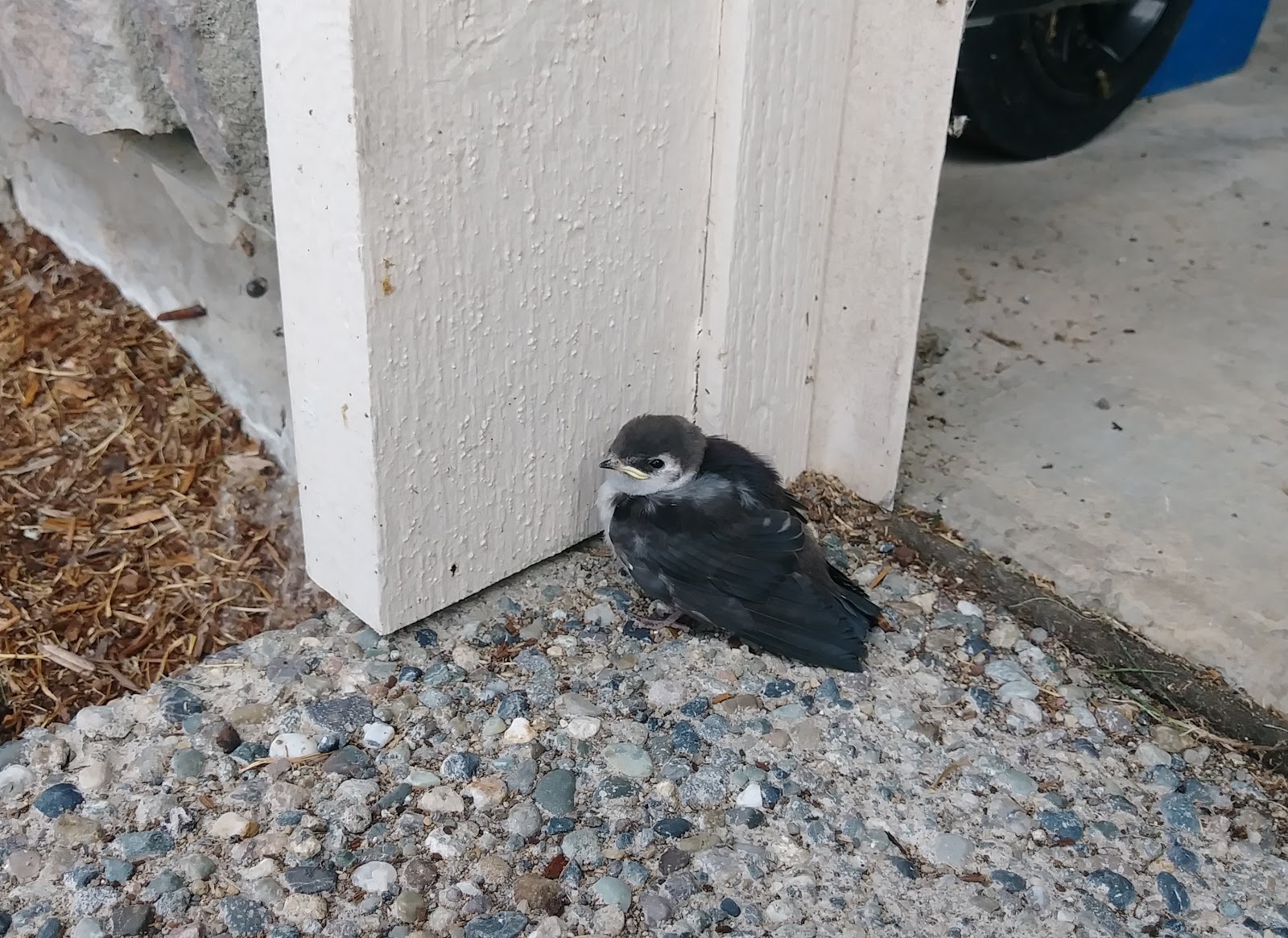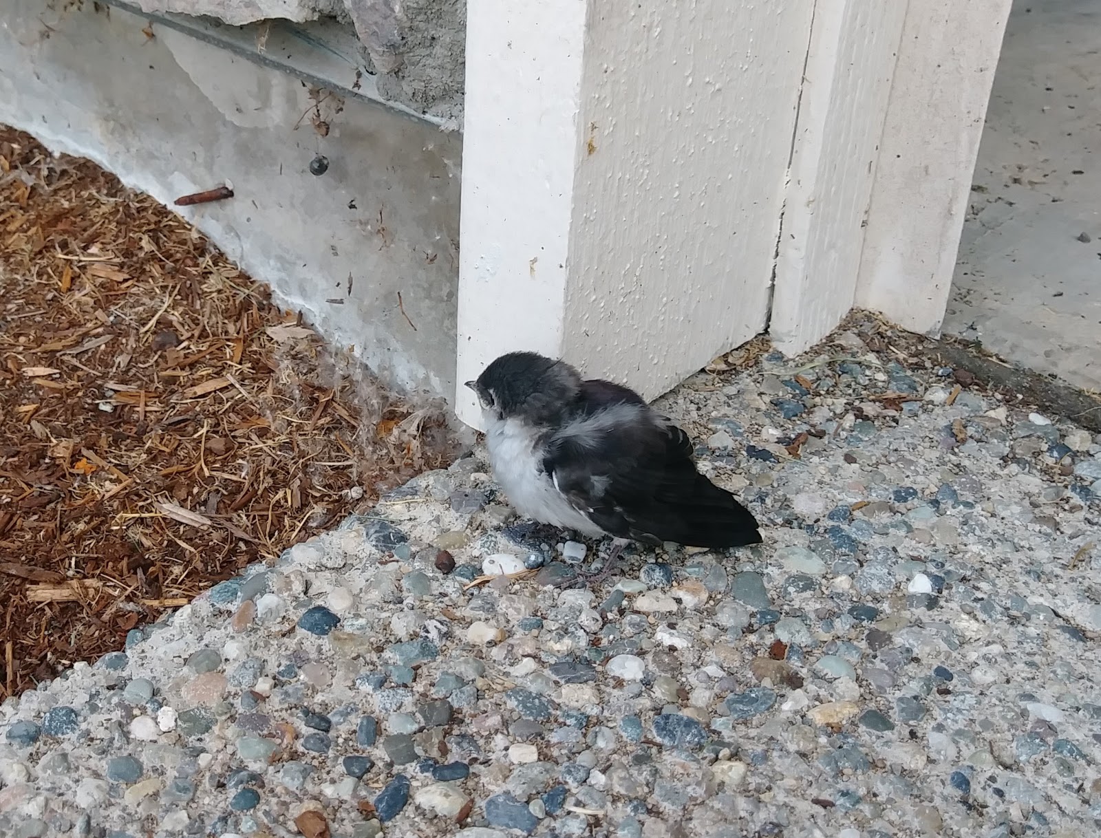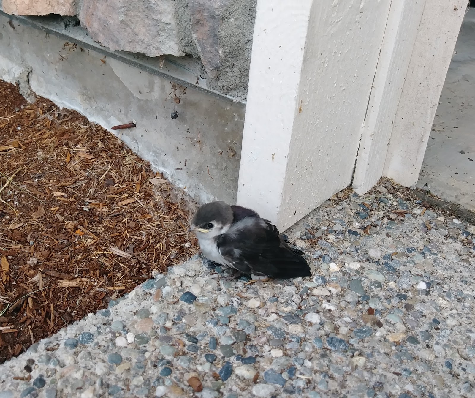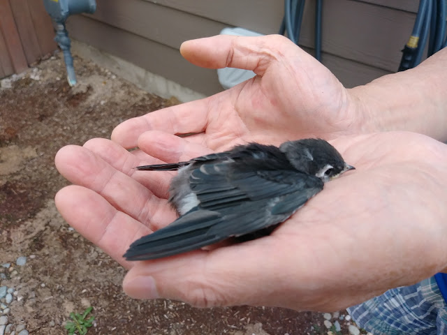 但是前幾天,卻發生了一隻小燕子的小插曲。我們從外面回來,看見一隻小燕子停在我們車庫前。車庫門打開時,她也不飛走,我們靠近她,她還是原地不動。仔細一看,原來是小燕子,可能是從他們的窩掉下來。