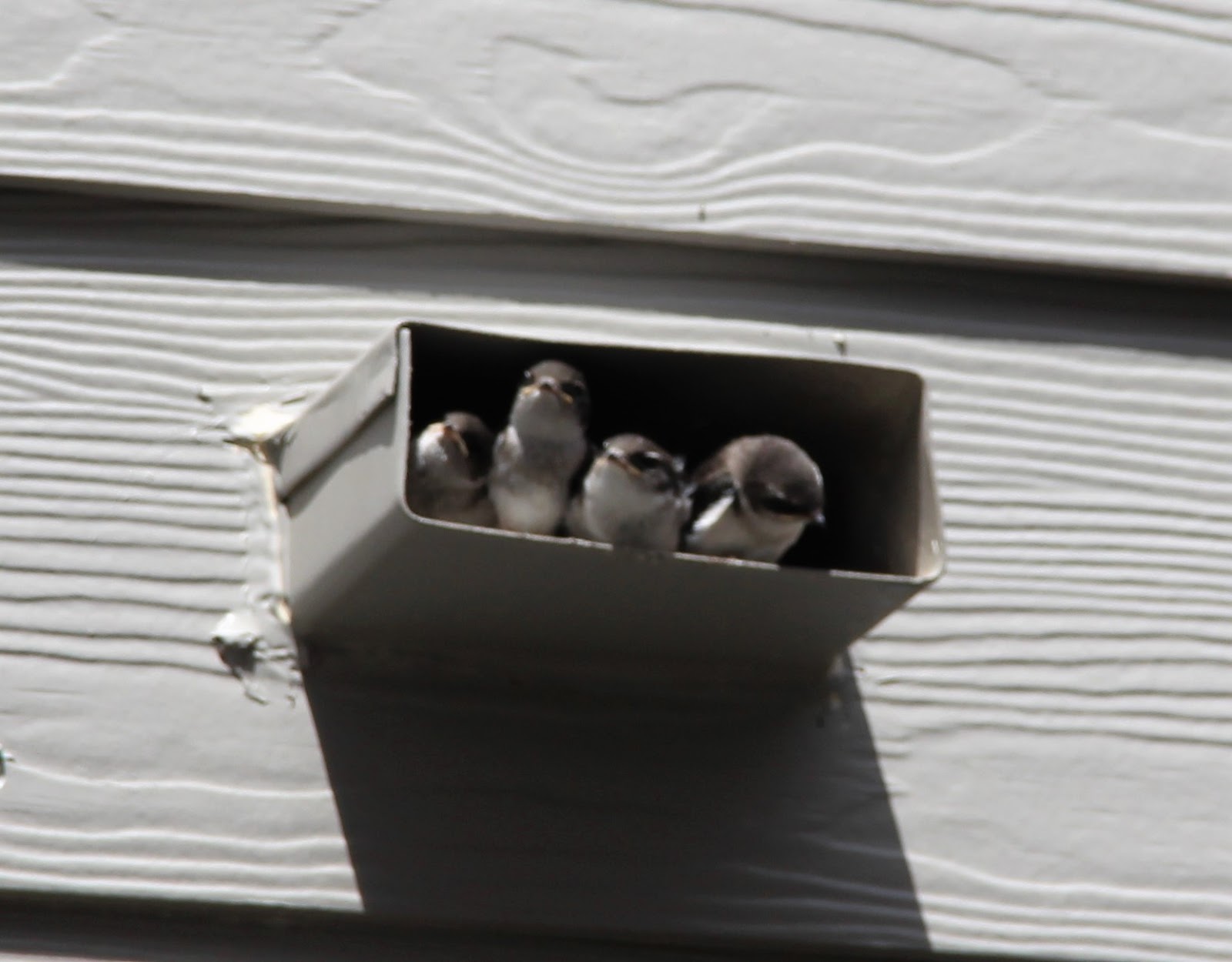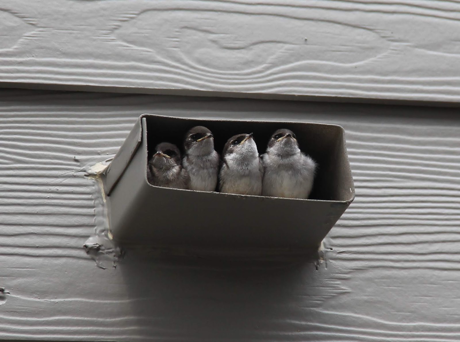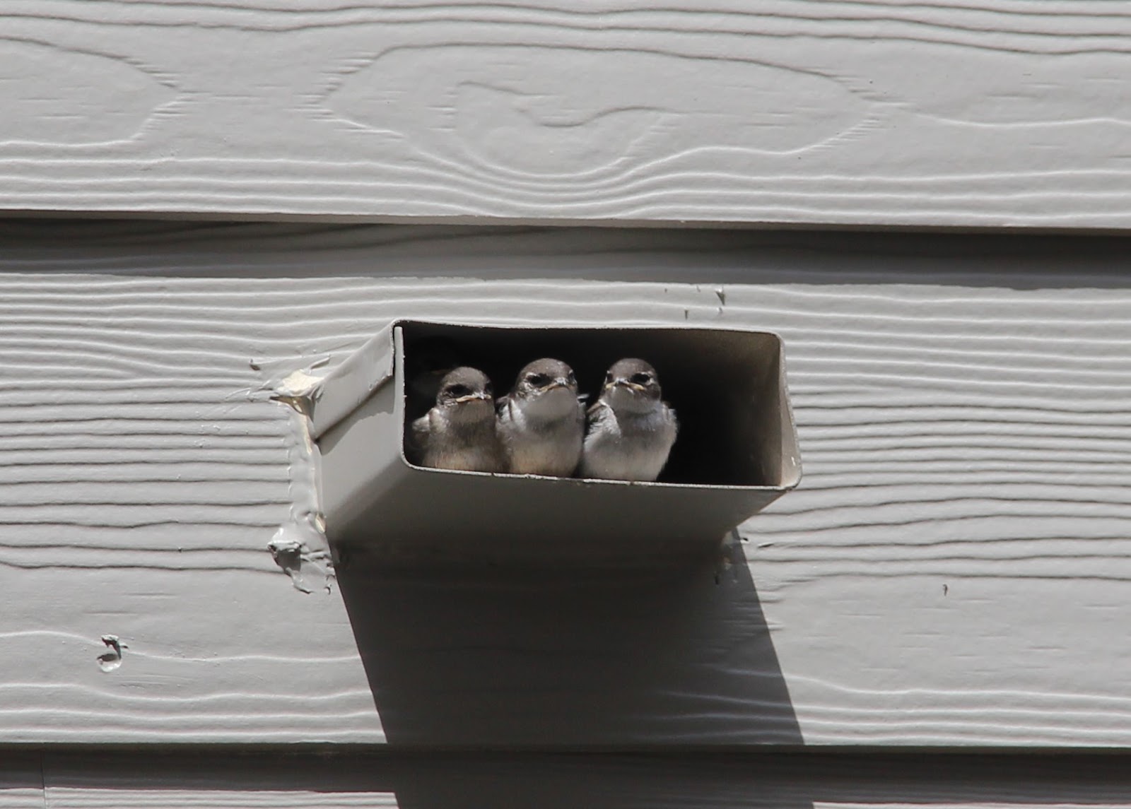 北美的燕子大多為家燕 (barn swallow),這是最常見普遍品種的燕子,並且分布全世界各大洲。家燕通常會在人類的建築物屋簷下銜泥築巢,根據專家說,一對燕子要來來回回的飛行1200次,才能築一個巢。我們家這對燕子實在太聽明了,在這沒有水的排水孔裡當成窩,既省去銜泥築巢來回1200次忙碌的飛行,又是一個隱密而安全,沒有人打擾的好窩。