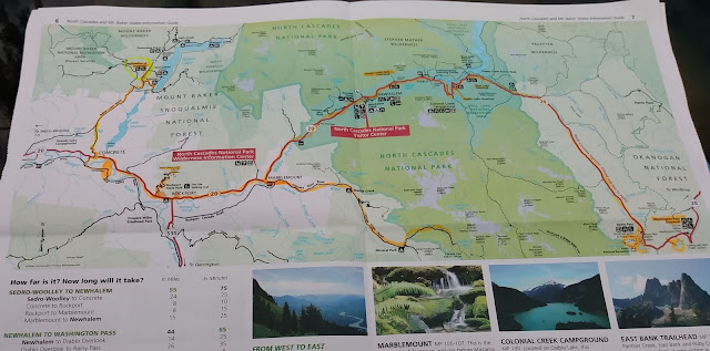 地圖上整個綠色區域,就是北瀑布國家公園,由斯卡吉特河 (Skagit River) 將國家公園分成南北兩個區域,而橘色的20號公路就是沿著斯卡吉特河而建。 我們住的城鎮是最靠西邊的 Concrete 水泥城, 第二天就要往東進入北瀑布國家公園。