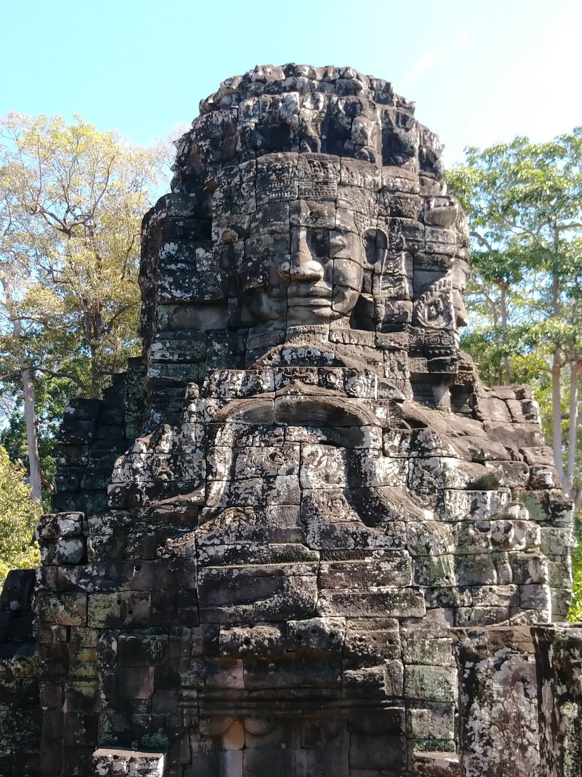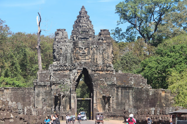 大吳哥城占地9平方公里,總共5個入囗門,除了東西南北各一個入囗門,東面又多了一個勝利之門。每個入口門都是由砂岩砌成,塔頂雕刻著四個微笑頭像,分別面向東西南北。 關於誰是這些微笑面孔,仍然存在爭論, 有的認為是觀世音菩薩,或是菩薩的組合,但許多的柬埔寨老百姓認為,這些面像是以國王闍耶跋摩七世的面容為藍本雕刻的。在通往城門口,護城河上的長堤兩側各有一排54個石像,左側是善神,右側是惡神,總共108名神話人物守護著吳哥城。
