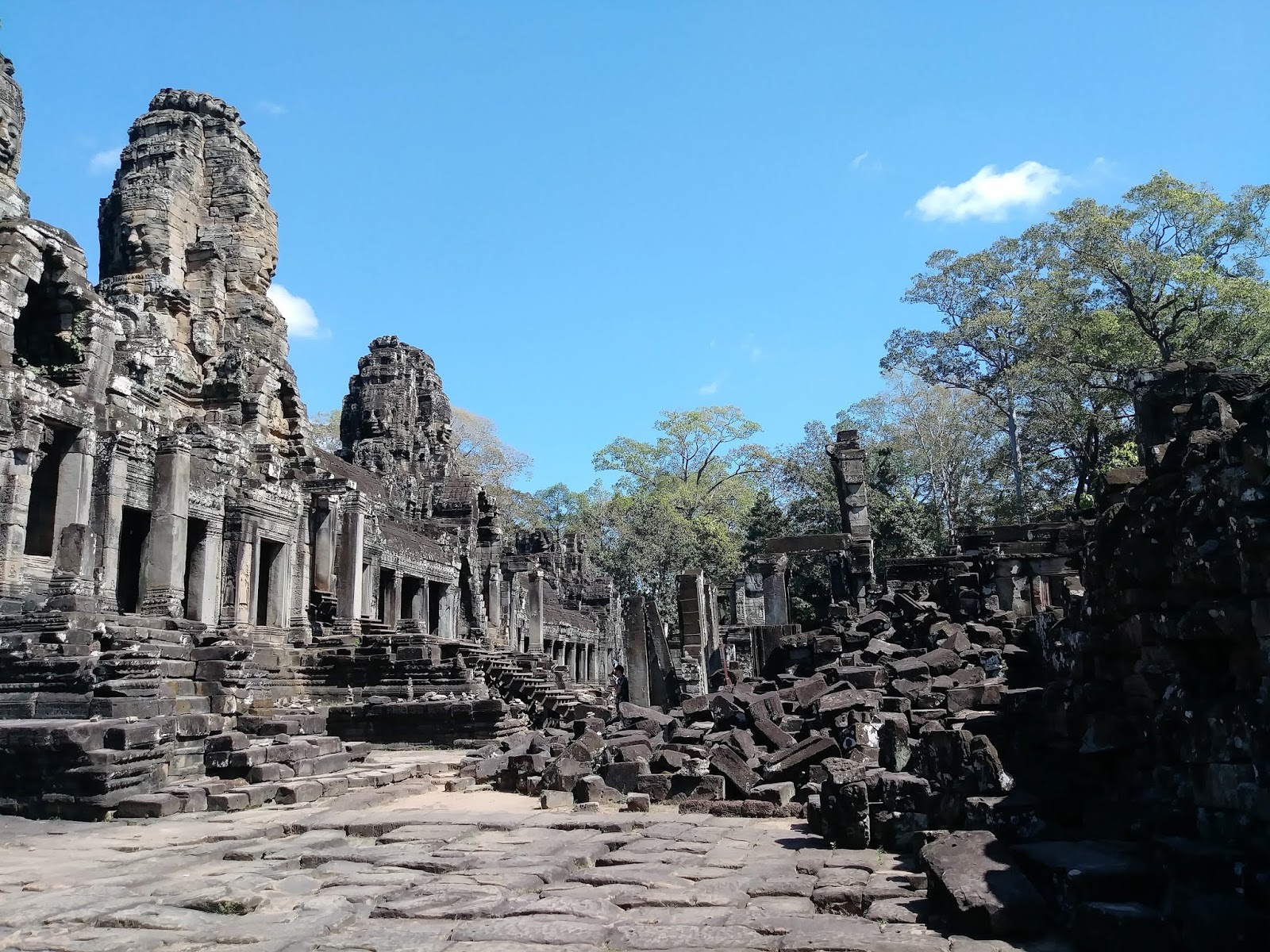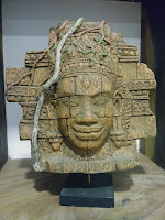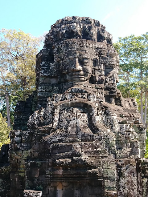 曾經聽過「微笑高棉」,但卻不知道其典故,直到進了據說當時住了百萬人口的大吳哥城 (Angkor Thom)。大吳哥是吳哥王朝的最後一個首都,建於12世紀末期,是由吳哥最有名的國王闍耶跋摩七世 (Jayavarman VII) 打敗占城人 (Cham) 後所建的。闍耶跋摩七世活了90歲,他歷經了吳哥的興盛與衰敗,看到了外敵的入侵,看到了國家的滿目瘡痍,於是放棄長子的王位繼承,讓弟弟當國王,自己帶兵打仗去了。當他打完勝仗回到家園,那時他已60歲,卻看見自己的國家一團混亂,於是在60幾歲後當上國王,所以也被稱為銀髮國王。