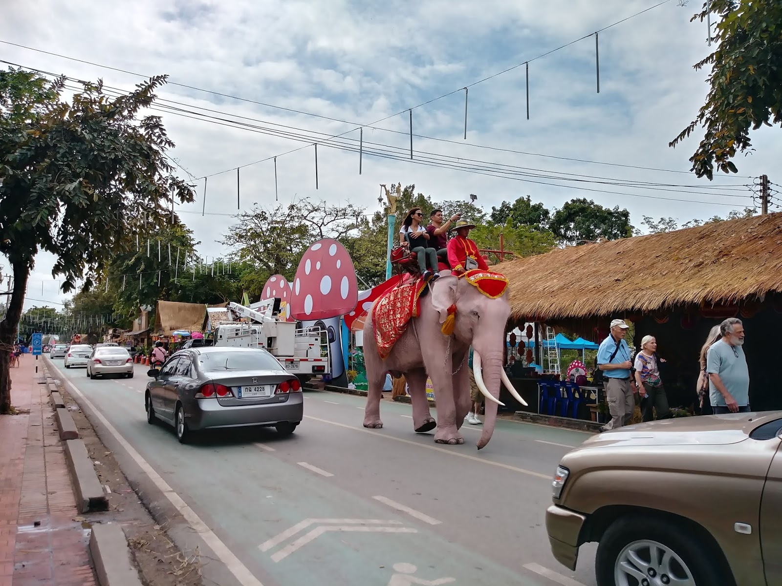 在帕蘭寺的門口,正好一隻粉紅色大象經過。