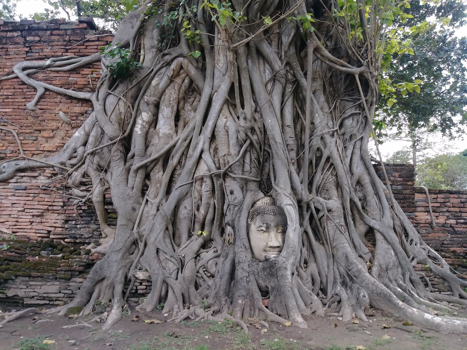 據說緬甸軍肆虐的砍佛首時,其中一顆佛首滾落至樹根底部,經年累月後被樹根包裹起來,後來整修時,發現了現在的 「樹中佛」奇景。