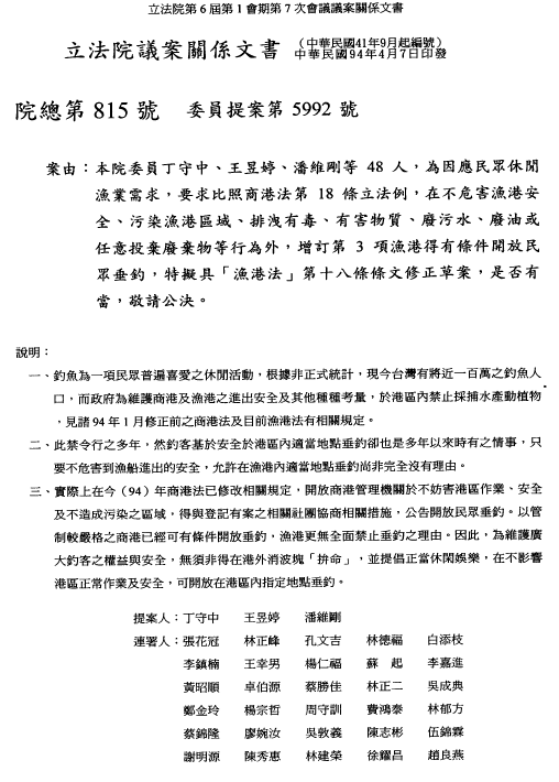 立委丁守中說,每到旺季,北海岸沿岸釣友雲集,比西門町還熱鬧,有人在危險性高的潮間帶或岩礁區垂釣,導致落水悲劇頻傳;中華民國釣魚協會秘書長陳平南說:「爭取那麼久,總算有結果。」