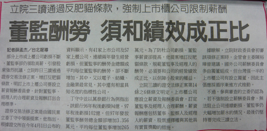 自2008年金融海嘯後,公司嚴重虧損而董監事及經理人酬勞仍大幅增加的肥貓問題已成眾矢之的,各國政府皆加速改革,以保障投資大眾利益。丁守中回應民意,快速提案修訂證券交易法第十四條之六,已於99.11.5經立法院三讀通過,明確要求已在證券交易所上市、或於證券商營業處所買賣之公開發行股票公司,應設置薪資報酬委員會,規範公司給付董監事或經理人的薪酬標準,應與公司經營績效成正比,以保障投資大眾權益、維護社會公平正義。