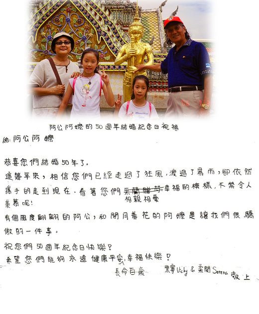 你們怎麼能夠寫的這麼好? 拍拍手!!!她們姊妹是阿公‧阿嬤‧的寶貝一生中得七位孫子是我最大的驕傲‧個個都很善解聰慧‧有大學的‧有高中的‧有國中的‧有小學生的‧嗨‧‧‧不賴吧‧謝了。 三姊 於 2011/08/04 19:13回覆