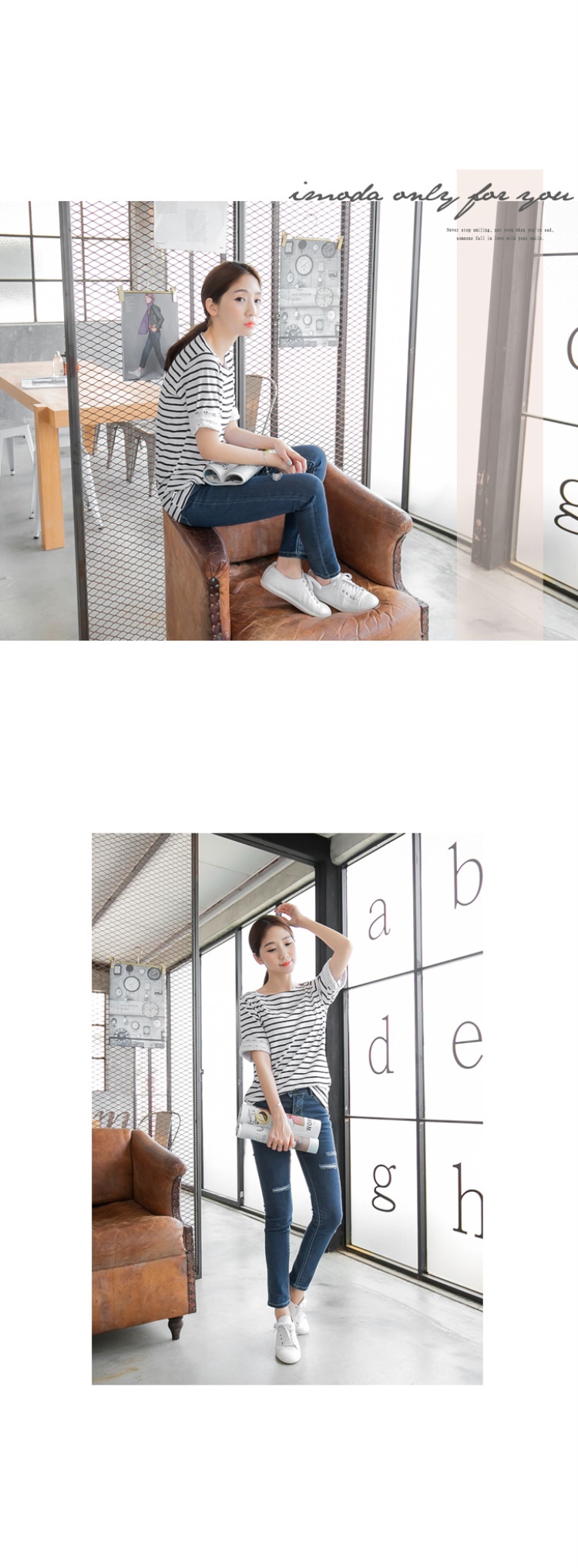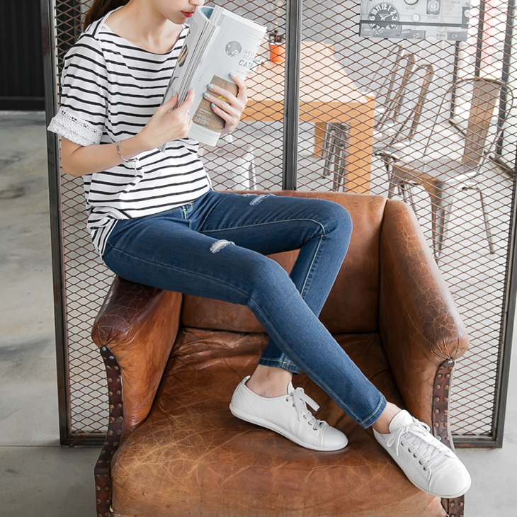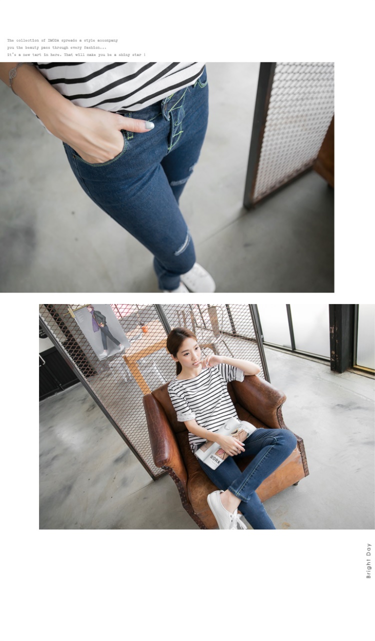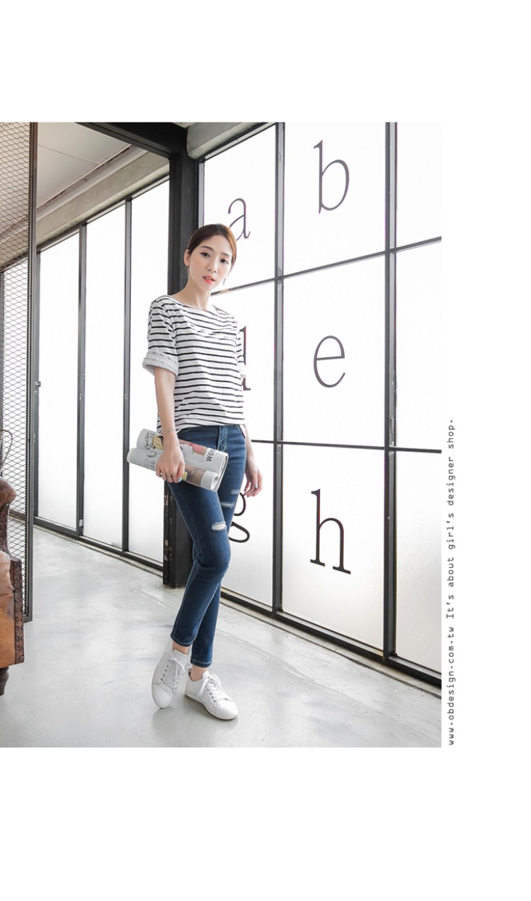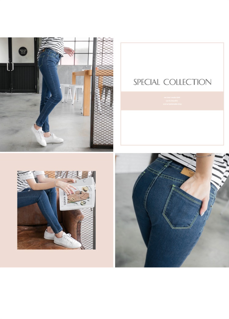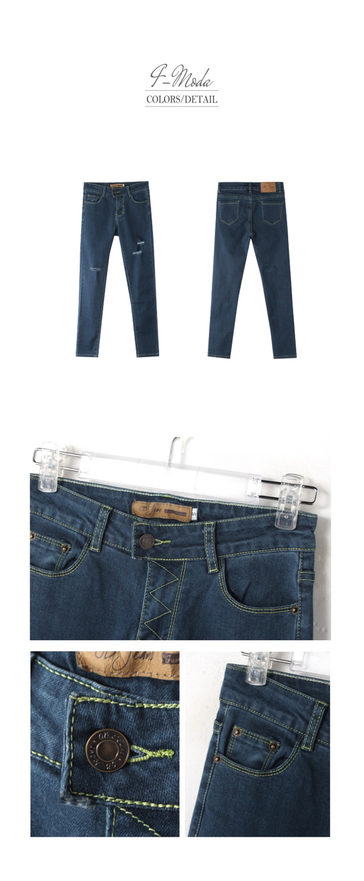 0613新品 螢光色車線顯瘦刷破牛仔窄管褲