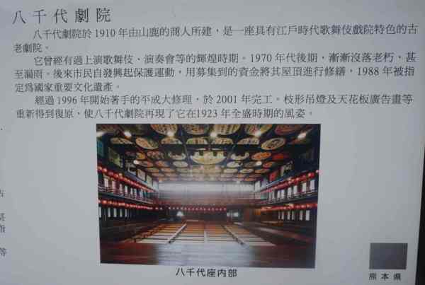 八千代座位於九州熊本縣山鹿這個小地方,1910年(明治43年)當地的士紳們,合資建造完成的八千代座,設有旋轉舞台、中席(舞台正前方的座位)、伸展式舞台等,是一座歷史悠久,傳承了江戸時代歌舞伎戲棚的知名戲院。