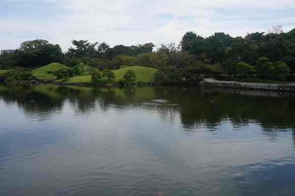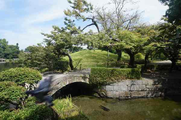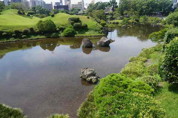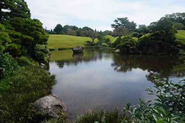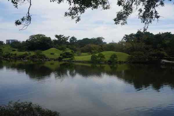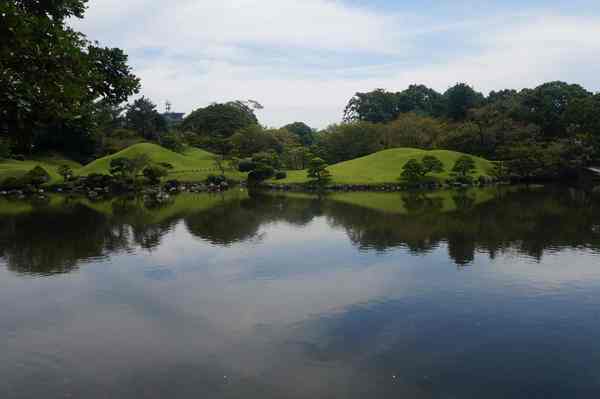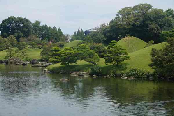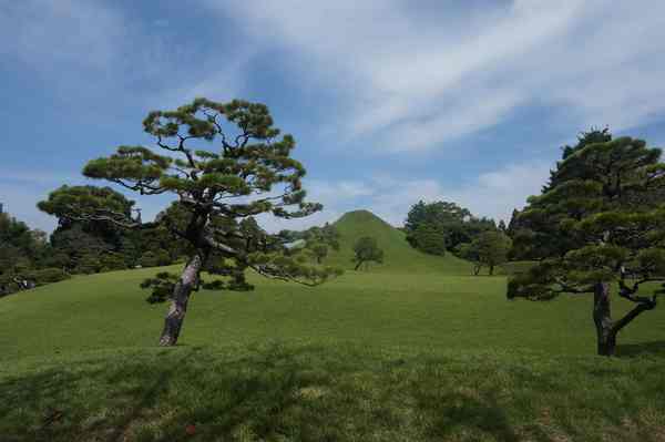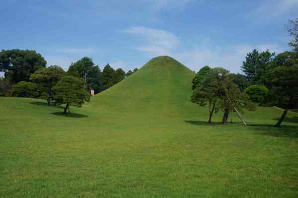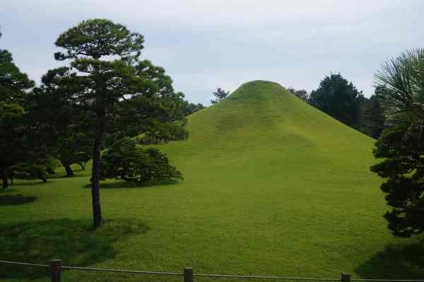 「築山」,即人造土丘-仿富士山。周邊為園林主體。細川家第4代當主細川綱利