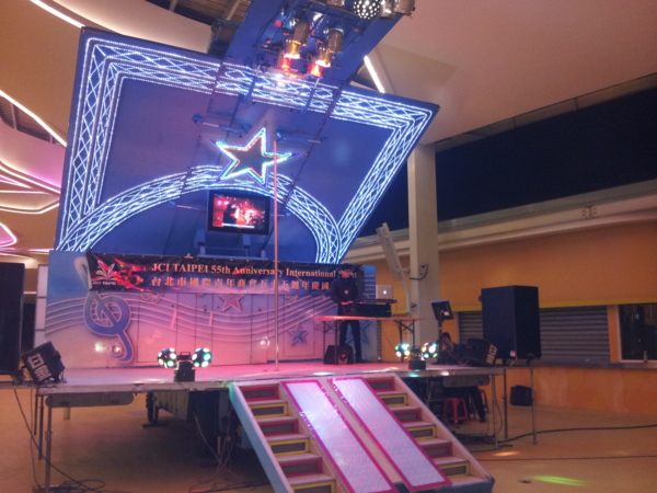 LED舞台燈10台,萬丈光芒燈1台,七彩旋轉燈1台,LED帕燈4台,LED跑馬燈1台,燈光控制器2台