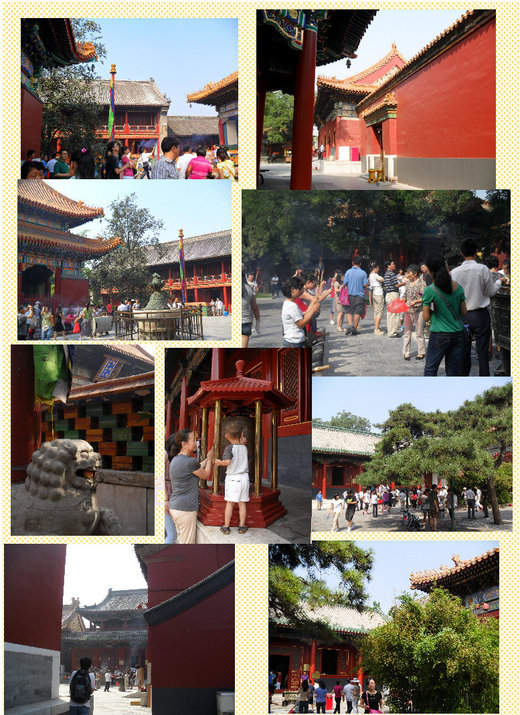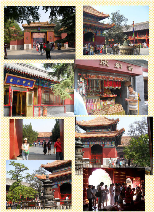 雍 和宮原本是雍正皇帝所居住,現在卻變成眾神居住之所.那天很多旅行團進入,將此地擠得水洩不通;一開始進入之初就被那寫著金色寶藏的宮殿所吸引.