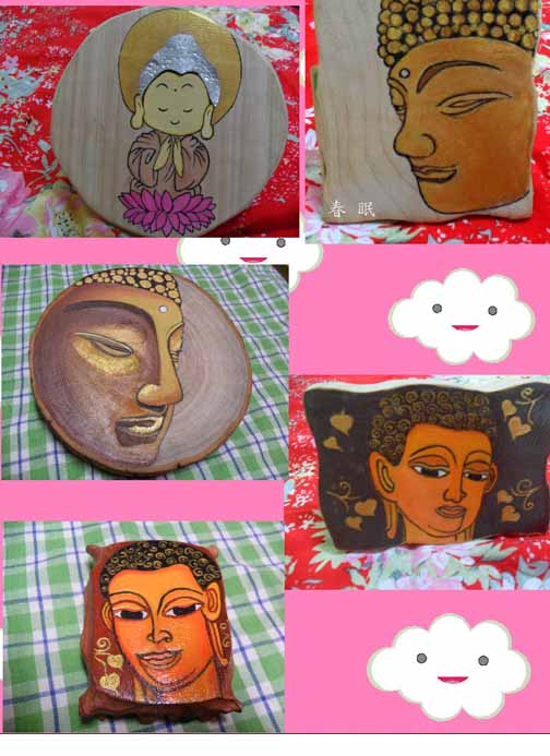 最近迷上檜木彩繪 , 其中 有一個橢圓形是前陣子去三義木雕街看到切割好的樟木 , 買回來畫成佛像 ,感覺還滿不錯 ,只是木頭會有不同色紋理,上起色會比較不均勻,有一塊四邊不規則的木頭是在天津洋貨市場挑到的 最近又託朋友幫我切割好幾塊相似檜木木頭 , 考慮畫成蓮花或荷花甚麼. 這些檜木或樟木都有著淡淡木頭香,盡量保留原木原色和香味 ,畫完還滿有成就感的.