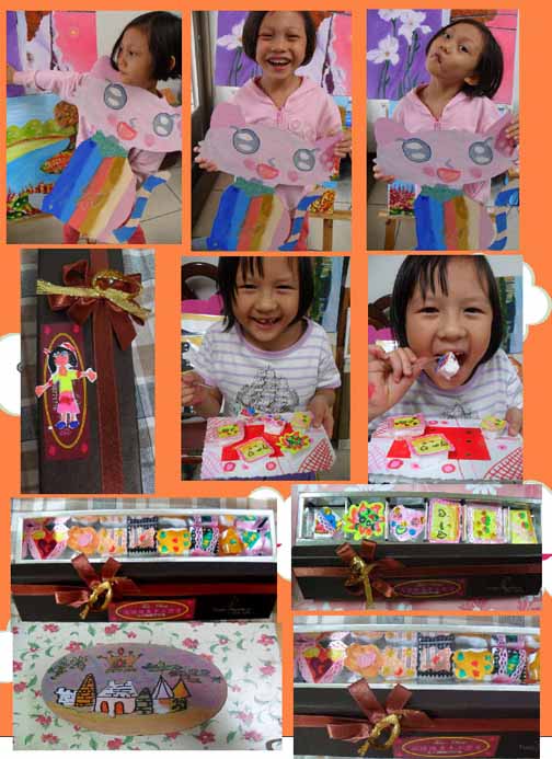 我讓年紀相近小女生做立體蛋糕再配在精緻盒子上, 假裝真的蛋糕 , 夾起蛋糕 吃的表情超極陶醉的 . 另一位小一女生表情也很古靈精怪的很可愛.
