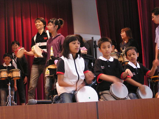 當生聲合唱團表演結束,原聲小朋友上台助興,兩個合唱團還玩開了,劉老師的臨時指導下,原聲小朋友開始「玩」起打擊樂器,有邦哥鼓、非洲鼓、康加鼓、鈴鼓、三角鐵…小朋友們就這麼隨興地玩耍、即興地學,連平時很好動不已的景文,自顧個兒很專注地打節拍,三年級伍承耀聽著劉老師指揮打起邦哥鼓可是很有大將之風,節拍掌握得可精準呢…這群「烏合之眾」竟能在劉老師指揮下,搭配生聲合唱團即興地演出一曲打擊樂。
