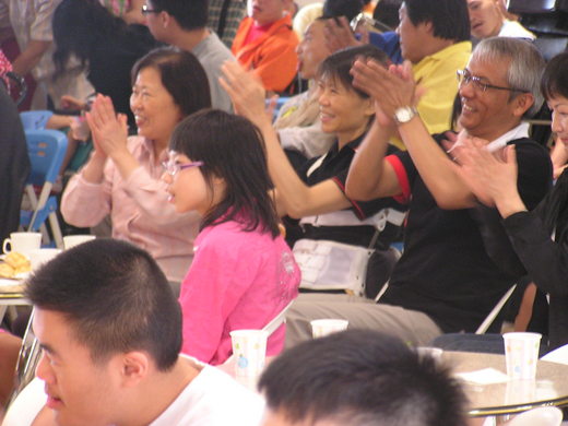 坐在台下同聲歡呼、拍手叫好的,除了八里教養院的殘障大朋友、原聲合唱團小朋友之外,還有他們所熟悉的美青姊姊。美青姊姊前些日子受了傷、雖然還處在復健療養階段,並不能像往常上天下海地趴趴走,她仍不忘記來到此,與大朋友、小朋友擁抱,與大家同歡。