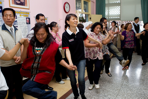 一走進安老院四樓大禮堂,老爺爺和老奶奶們為歡迎小朋友到訪,利用簡單打擊樂器敲擊出《高山青》等歌曲,而台下熱情的布農族家長先跟著哼唱、打拍子,然後年輕家長站起來跳起山地舞,而美青姊姊主動跟著加進來,為老人們熱情伴舞,接著連巧蝶阿嬤、念緹阿嬤也腳癢加進了跳舞的隊伍,繞著大禮堂轉圈,氣氛好不熱鬧啊,寧靜的安老院傳來歡樂的聲音。