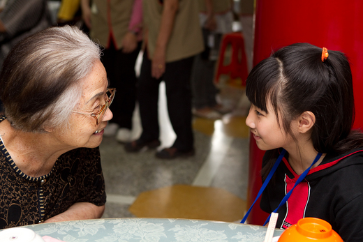 曲畢,小朋友們紛紛走下台,將他們前一晚熬夜畫的卡片,一一送給爺爺奶奶們,小朋友的天真與善良,老少同堂同歡樂,讓老人們開心又感動。
