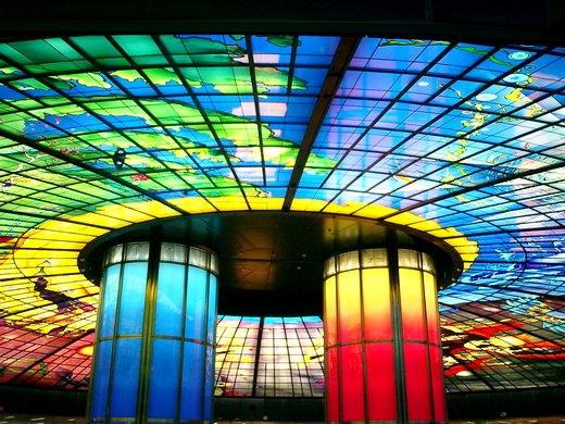高捷標榜的是建築美學,最著名的當然就是美麗島站的 光之穹頂,由義大利藝術家所設計,利用1252片手工鑲箝彩繪藝術玻璃所構成,所要呈現的是一種生命哲學:中央是代表陰陽的支柱,圓頂的四大區塊用顏色區分出- 生命的水,成長的土,創造的光,戰爭的火.