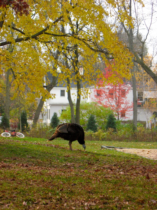 才買了一隻十二磅的火雞,用折扣卷後不到六洋元。比起去抓野火雞可能太費事。況且這個社區不能狩獵,所以火雞的敵人其實是老鷹和梟不是獵人。這隻是好幾年來都在這裡悠遊的三姐妺之一,也是僅存的一隻。