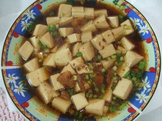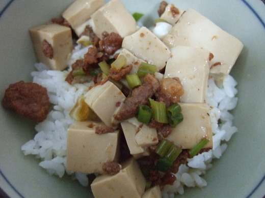 將豆腐打開,置放在室溫下10-15分鐘讓它釋出水份,接著切塊。在鍋中倒點水,放入醬油,待水滾後將豆腐和肉醬放入其中,等豆腐兩面染色之後,灑點蔥花就能起鍋了。