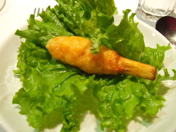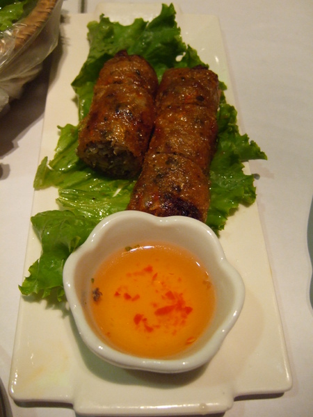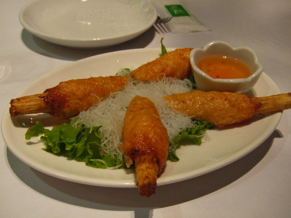 蔗蝦是用蝦泥裹住一小節甘蔗,炸到金黃後才上桌的餐點,吃的時候可以拿片生菜,沾點魚露包著吃。除了蝦肉之外,我也很愛吸吮裹在蝦肉裡甘蔗鮮甜的滋味。