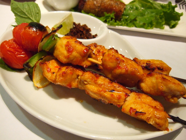串燒沙嗲雞的雞肉和醬料說不上特別好吃,倒是串燒前端的烤蕃茄和青椒我還蠻喜歡的。另外,沙嗲雞的盤子上放了一小碗沾料,從外觀看像花椒,吃起來又不太像台灣常見的乾花椒,吃起來味道偏鹹,後問了服務生確認是花椒,我想問的是越南的花椒都被醃漬成這樣,還是只有部分為了調味方便,才這樣製作的?(有人可以告訴我嗎?!)