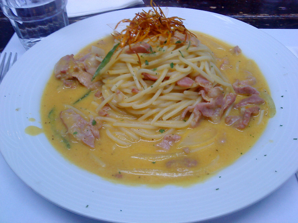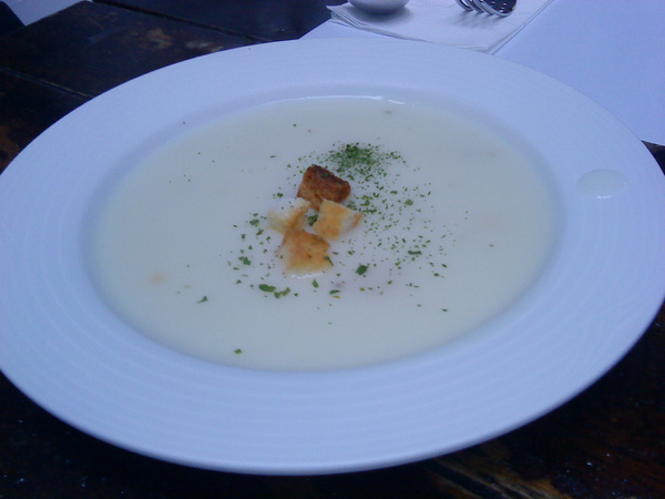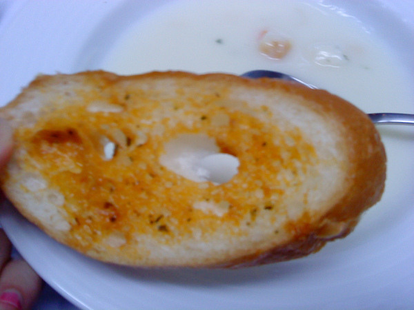 它的麵包、沙拉和飲料(我點熱奶茶,喝起來很稀)一般。濃湯誠意十足,味道中等。義大利麵煮的還不錯,麵條熟了但沒透,有點咬勁,我喜歡,至於我點來搭配義大利麵的南瓜奶油醬,除了顏色提醒我裡面有南瓜外,其實沒有很濃的南瓜味。甜點我交給愛吃甜食的Tammie幫我解決,據說甜度頗高。