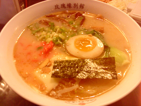 玫瑰緣別館標榜的是老闆特地去日本,向電視冠軍這個節目裡的拉麵冠軍請益拉麵作法,後又回台灣開了這家店,既然這樣到這裡來當然要點老闆的自滿之作,也就是招牌熊本豚骨拉麵(200元)。