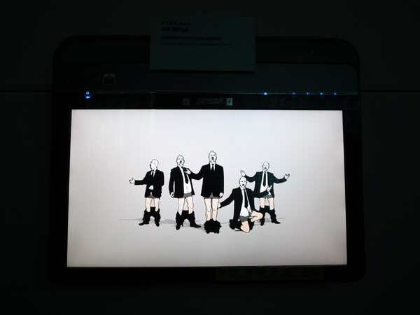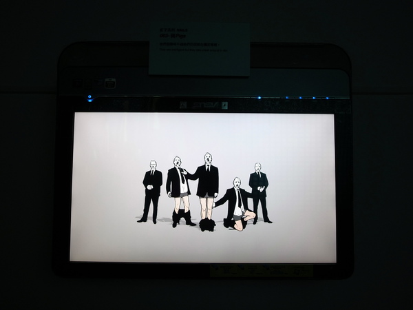 觸碰式的互動作品,按下螢幕上的人物,他的褲子就會往下掉。