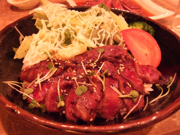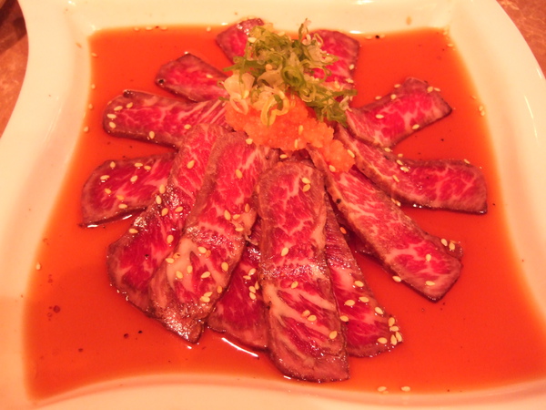 吳小豪除了點主餐之外,還點了生牛肉這道小菜,雖然牛肉吃起來比較嫩(廢話,是生的耶),但是它和牛排丼上的肉基本上是一樣的,只是後者被煮熟了。