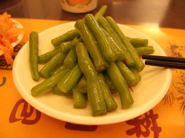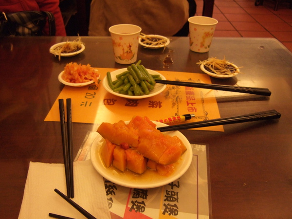 我們點了兩籠小籠湯包(每籠90元),一籠蟹黃湯包,一籠乾隆灌湯包,一盤煎餃,一籠蒸高麗菜,一盤牛肉捲餅,一碗元盅雞湯,一碗油豆腐湯,兩碟小菜,分別為四季豆和南瓜。南瓜味道很樸實,但卻讓我覺得格外的幸福,尤其是外食慣了之後,很難吃到沒有添加過多味道的餐點。小籠湯包皮雖Q,但肉餡一般,包在裡頭的高湯不夠燙口,吃起來不大過癮。