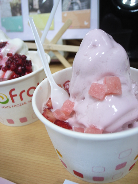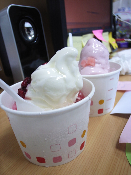 洪娃和lulu嚷著要吃yofroyo已經一段時間,終於在前陣子去買來吃了。洪娃回辦公室時滿面春風,說她不但看到傳說中的帥氣店長,還碰到倪安東(有看星光的應該知道他是誰),讓她心情頓時嗨到最高點。