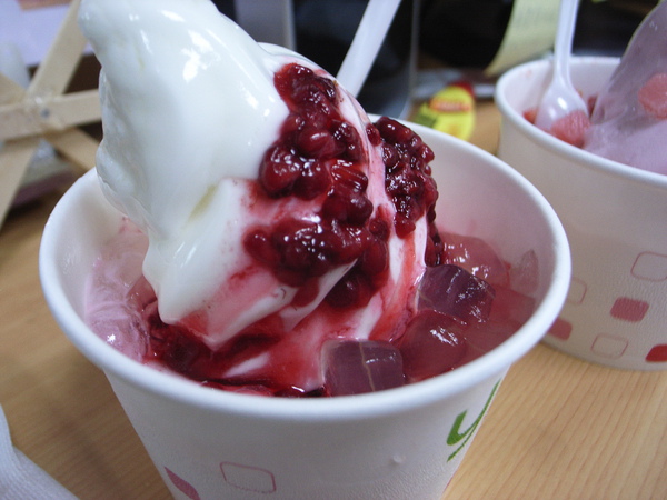 優格冰淇淋吃起來很滑順,味道也不像市售冰淇淋那麼甜膩,我很喜歡。覆盆子的酸度也替冰淇淋提了點味,蒟蒻和蘆薈也讓優格冰淇淋增色不少。整體來說味道還不錯,不過洪娃選的藍莓優格冰淇淋和麻糬的組合更讓我驚艷。下回肯定要點這個組合大快朵頤一番。